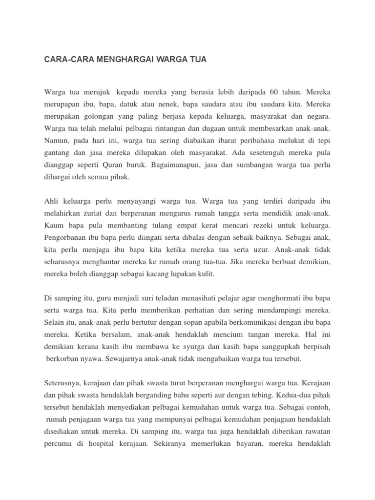 . Arahkan mereka untuk makan makanan sehat berolahraga secara teratur tidur dengan cukup dan menjauhi alkohol tembakau serta obat-obatan terlarang. Berikut ini adalah contoh karangan UPSR bagi tajuk Cara-cara Menghormati Ibu Bapa. Menghormati Orang Tua Assalamualaikum Warrahmatullahi Wabarakatuh.